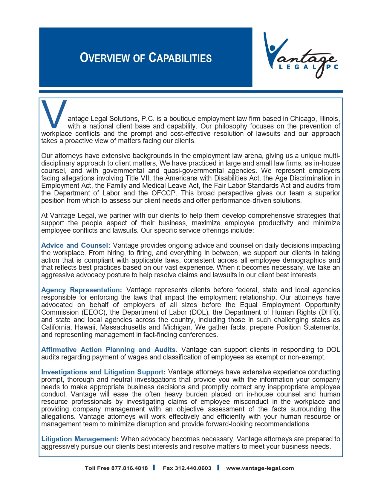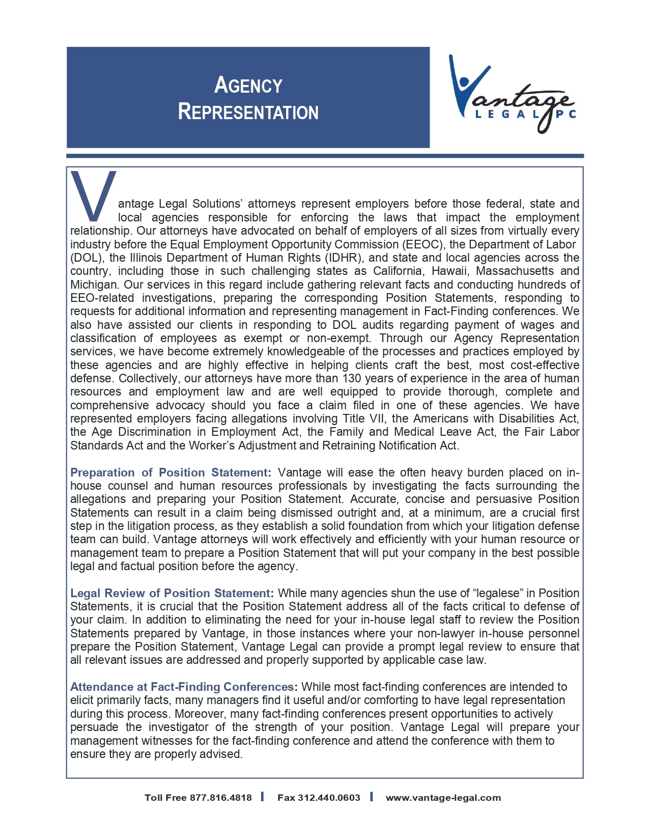 Explore these documents from Vantage Legal Solutions and our sister company, Vantage Solutions LLC, to learn more about our expertise and comprehensive services. Included are Agency Representation, Overview of Capabilities, and In-House Solutions, each outlining how we support businesses with employment law and human capital strategies.