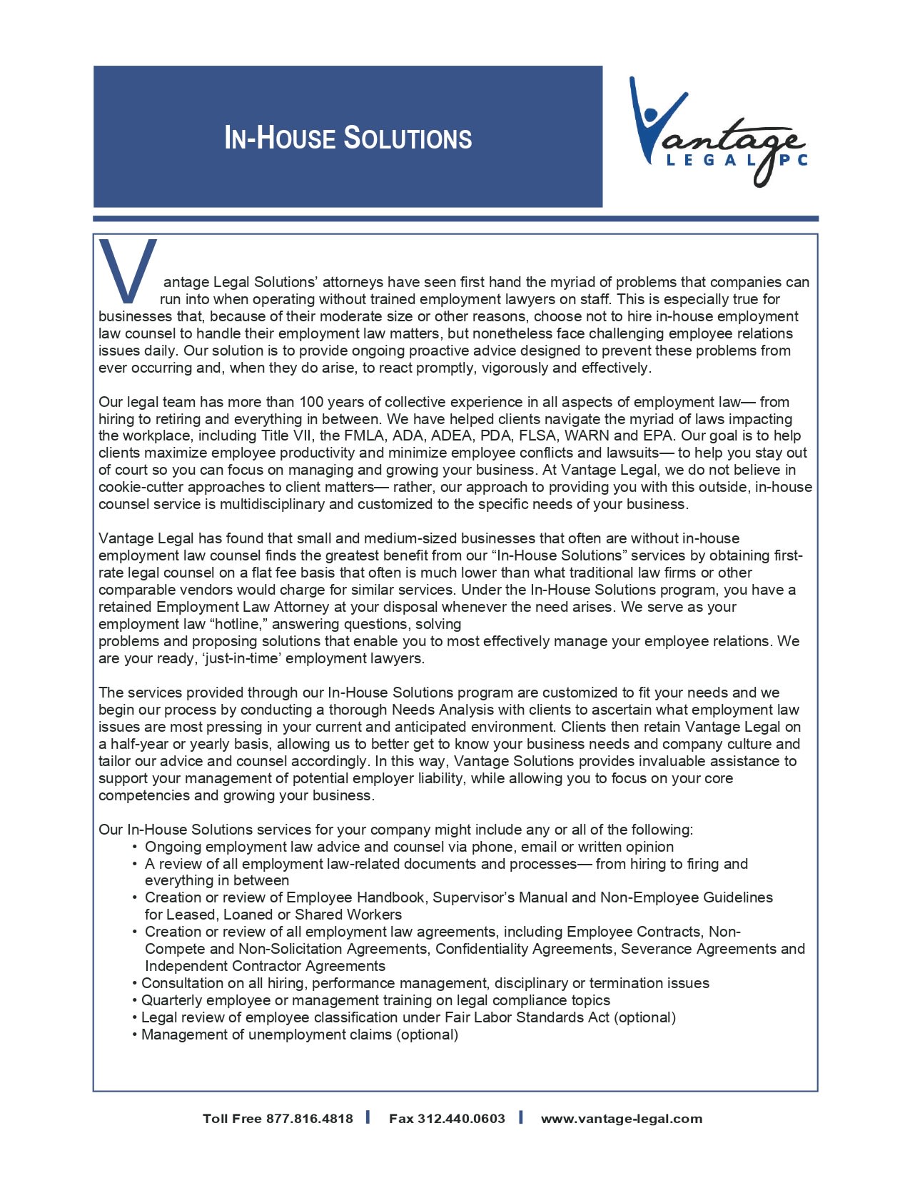 Vantage Legal Solutions P.C. stands as a comprehensive employment law boutique in Chicago. We specialize in employee handbook development, workplace investigations, audits, and training. With a proactive approach, we ensure your business stays compliant and productive. Discover tailored legal support today. Contact us via email or call at (312) 440-0602.